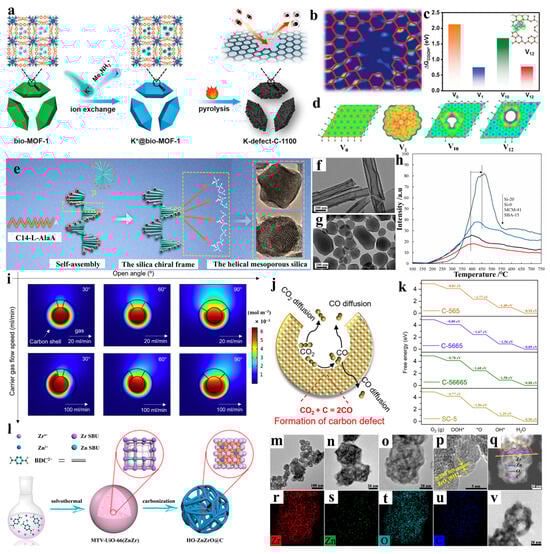 (a) Illustration for the fabrication of K-defect-C-1100 via K+-assisted strategy. The introduction of K+ to give K+@bio-MOF-1 by ion exchange is crucial in the first step, prior to the pyrolysis. (b) The HAADF-STEM image of K-defect-C-1100 after fast Fourier transformation filtering. (c) Free energy changes of COOH* formation (inset: electron density difference analysis of CO2 adsorbed on V12; yellow and cyan stand for charge accumulation and depletion, respectively). (d) Electrostatic potential of V0, V1, V10 and V12 sites (blue region corresponds to positive electrostatic potential, and purple region represents negative electrostatic potential. The more negative the electrostatic potential, the easier it will attract electrophilic CO2 molecules). Reprinted with permission from Ref. []. Copyright John Wiley and Sons, 2022. (e) The formation of the helical mesoporous silica. TEM images of different ordered helical-mesoporous SiO2 samples (f) Si-0; (g) Si-20. (h) TPD-CO2 results of different mesoporous silica. Reprinted with permission from Ref. []. Copyright Elsevier, 2021. (i) Comparison of CO2 gas diffusion state on carbon cavity with different open angles (30°, 60°, and 90°) and carrier gas flow speeds (20, 50, and 100 mL/min) at 10 ns. (j) Diagram of CO2 gas diffusion in the carbon cavity and relevant redox reactions during the pyrolytic process. (k) Free energy diagrams of the SC-5, C-56665, C-5665, and C-565 models at a potential of 0 V. Reprinted with permission from Ref. []. Copyright Elsevier, 2022. (l) Fabrication strategy of HO-ZnZrO@C. (m–o) TEM, (p) high-magnification TEM images, (q) HAADF-STEM and line scan profiles, (r–u) EDX mapping, and (v) cross-sectional TEM images of HO-ZnZrO@C. Reprinted with permission from Ref. []. Copyright American Chemical Society, 2020.
