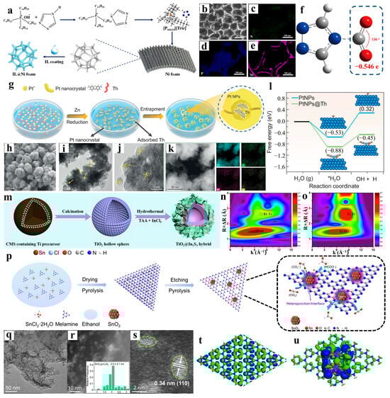 (a) Fabrication process of IL@Ni foam electrocatalysts. (b) SEM images of [P66614][Triz]@Ni foam. EDS elemental mapping images of [P66614][Triz]@Ni foam showing the EDS signals of N (c), P (d), and Ni (e). (f) Optimized geometries of the [Triz]−CO2− ion. Atom key: C atom (● gray), H atom (○), O atom (● red), and N atom (● blue). Reprinted with permission from Ref. []. Copyright American Chemical Society, 2022. (g) Schematic illustration of synthesis of PtNPs@Th. (h) FE-SEM image of the PtNPs@Th composite. (i) TEM image of the PtNPs@Th sample. (j) HR-TEM image of PtNPs@Th. Each small nanoparticle is composed of interconnected nanocrystals (green circles) surrounded with intercalated and marginal Th molecules (yellow arrows), indicating that Th may be encapsulated in PtNPs. (k) EDX elemental mapping images of PtNPs@Th, showing the signals of Pt, C, N and S. (l) Calculated energy barriers of water dissociation on Pt and Th-Pt (111) surfaces. Reprinted with permission from Ref. []. Copyright Oxford University Press, 2024. (m) Schematic illustration of the overall synthesis process for TiO2@In2S3 hybrid. Wavelet transform of (n) TiO2 and (o) InTi-0.54. Reprinted with permission from Ref. [].Copyright Elsevier, 2024. (p) Schematic illustration of the synthesis procedure for SnO2/g-C3N4. (q) TEM image of SnO2/g-C3N4. (r,s) Aberration-corrected HADDF-STEM image of SnO2/g-C3N4 (green circles, SnO2 NDs), the inset shows the corresponding histograms of the size distribution. 3D contour plot of electronic distributions of (t) g-C3N4 and (u) SnO2/g-C3N4. Gray balls represent C, blue balls represent N, purple balls represent Sn, and red balls represent O. The blue isosurface represents bonding orbitals, and the green isosurface represents antibonding orbitals. Reprinted with permission from Ref. []. Copyright American Chemical Society, 2023.