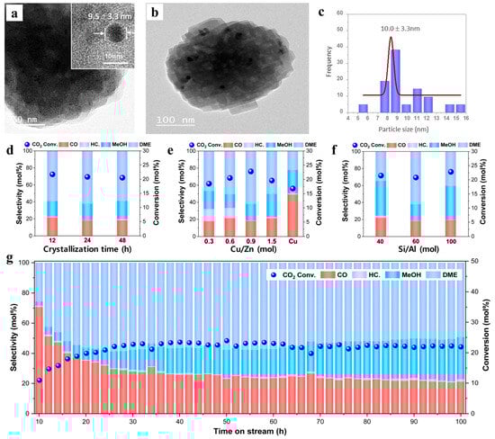 (a) TEM and inset HR-TEM images of the fresh catalyst CZ(0.9)@Z(60)-24. (b) TEM image and (c) size distribution of the used CZ(0.9)@Z(60)-24 catalyst after 100 h reaction. Catalytic activity of the CZ(x)@Z(y)-t catalysts: (d) CZ(0.9)@Z(60)-t at different crystallization times (t = 12, 24 and 48 h). (e) CZ(x)@Z(60)-24 for different Cu-to-Zn molar ratios (x = 0.3, 0.6, 0.9, 1.5 and only Cu metal). (f) CZ(0.9)@Z(y)-24 for different Si/Al molar ratios (y = 40, 60 and 100). (g) Catalytic activity of CZ(0.9)@Z(60)-24 with time on stream at 260 °C and 5.0 MPa. Reprinted with permission from Ref. []. Copyright Royal Society of Chemistry, 2025.