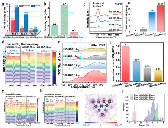 (a) Particle size of the catalysts before and after long-time DRM reaction. (b) Sintering rate of the catalysts. (c) Lewis acid site of pyridine-adsorbed FT-IR over different catalysts. (d) In situ CH4-DRIFT spectra. (e) CH4-TPSR and (f) its area normalization results. (g,h) comparison of in situ DRIFT spectra for the DRM reaction. (i) Differential charge density of ultra-small Ni catalyst. (j) PDOS analysis of the Ni/S-SBA-15-OH catalyst. Reprinted with permission from Ref. []. Copyright John Wiley and Sons, 2024.