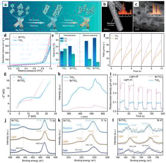 Meng et al. [] developed a novel Bi/TiO2 photocatalyst by anchoring Bi clusters onto porous TiO2 nanowires through alkali thermal synthesis, acid etching, high-temperature treatment, and wet impregnation (Figure 17a). The TiO2 nanowires exhibited a 1D structure with an average mesopore diameter of 6.6 nm on the nanowire walls, while Bi clusters (~2.2 nm) were confined within the pores (Figure 17b,c). The specific surface area of Bi/TiO2 (112.24 m2/g) surpassed that of pure TiO2 (73.86 m2/g) (Figure 17d). The Bi/TiO2 achieved 86.8% selectivity for CH4, significantly higher than TiO2 (46.2%), with a stable yield over five cycles, confirming structural robustness (Figure 17e,f). Electrochemical analysis revealed a smaller impedance arc radius for Bi/TiO2, indicating faster charge transfer (Figure 17g). The significantly reduced photoluminescence intensity of Bi/TiO2 suggested that Bi acted as an electron acceptor to suppress carrier recombination (Figure 17h). Bi/TiO2 exhibited a higher photocurrent density, verifying the enhanced separation efficiency of the photogenerated electron-hole pairs (Figure 17i). XPS analysis demonstrated that under light, Ti 2p and O 1s peaks shifted to lower and higher binding energies, respectively, reflecting electron transfer from O to Ti. The Bi 4f peaks shifted to lower binding energies, indicating Bi participated as an electron donor during the reduction process (Figure 17j–l).
