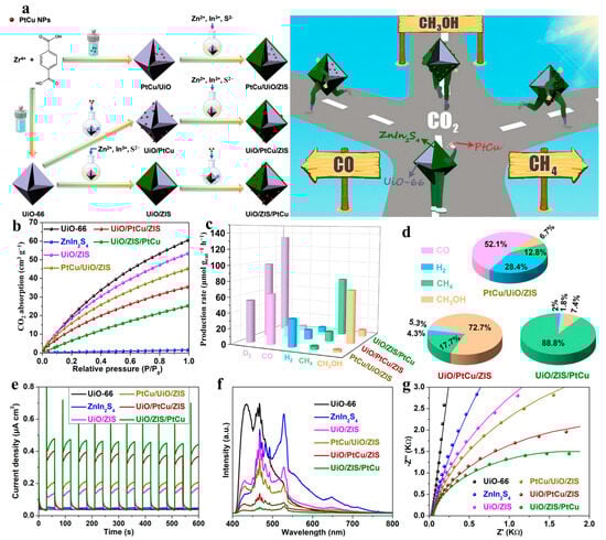(a) The syntheses of PtCu/UiO/ZIS, UiO/PtCu/ZIS, and UiO/ZIS/PtCu involve three fundamental steps. PtCu at different locations yields distinct target products. (b) CO2 adsorption isotherms. (c) Comparative CO, H2, CH4, CH3OH, and O2 evolution rates. (d) Product selectivities of PtCu/UiO/ZIS, UiO/PtCu/ZIS, and UiO/ZIS/PtCu. Charge kinetics analysis: (e) photocurrent densities, (f) steady-state PL spectra, (g) electrochemical impedance spectroscopy (EIS) Nyquist plots. Reprinted with permission from Ref. []. Copyright American Chemical Society, 2025.