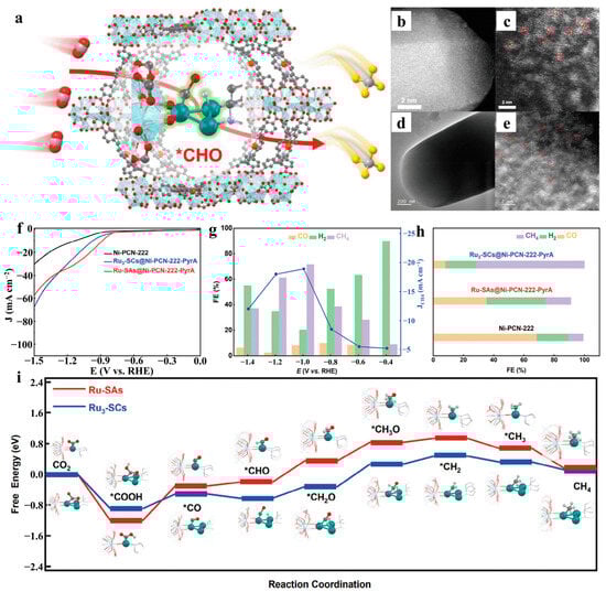 Mo et al. [] developed a composite catalyst, Ru3-SCs@Ni-PCN-222-PyrA, featuring Ni-PCN-222-PyrA-supported triruthenium single clusters (Ru3-SCs) for efficient electrocatalytic CO2 reduction to methane. Using a pre-coordination strategy, Ru3(CO)12 was encapsulated into the PyrA-modified Ni-PCN-222 channels, followed by microwave treatment to release CO and form Ru3 single clusters (Figure 19a). The Ru3 formed single clusters (≈0.8 nm, bright spots composed of three atoms) in Ru3-SCs@Ni-PCN-222-PyrA, while Ru-SAs@Ni-PCN-222-PyrA exhibited isolated single-atom bright spots, providing a basis for subsequent performance comparisons (Figure 19b–e). LSV curves demonstrated that Ru3-SCs@Ni-PCN-222-PyrA achieved a significantly higher current density (−68 mA∙cm−2 at −1.5 V vs. RHE) than Ru-SAs@Ni-PCN-222-PyrA (Figure 19f). Additionally, Ru3-SCs@Ni-PCN-222-PyrA exhibited superior CH4 selectivity (71.8% at −1.0 V vs. RHE) compared to Ru-SAs@Ni-PCN-222-PyrA (16.8%) and Ni-PCN-222 (10.1%) under the same applied potential (Figure 19g,h). Simulations of the Gibbs free energy profiles showed that the energy barrier for *CO and *H coupling to form *CHO on Ru3-SCs was significantly lower than that on Ru-SAs, confirming that the synergistic effect reduced the reaction difficulty (Figure 19i). After CO2 adsorption on the active Ru3-SCs, a series of proton-coupled electron transfer processes occurred, forming intermediates such as *COOH, *CO, *CHO, *CH2O, and *CH3O, ultimately yielding the final product, CH4.