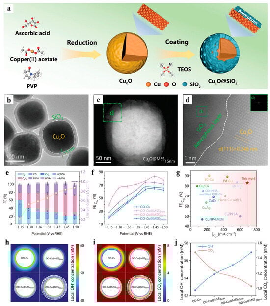 Wang et al. [] investigated the regulatory mechanism of mesoporous SiO2 shell-coated Cu2O nanospheres for CO2 electroreduction to multi-carbon products (C2+). The synthesis involved preparing Cu2O cores and controlling the SiO2 shell thickness via the Stöber method (Figure 20a). TEM and HAADF-STEM images revealed the core-shell structure of Cu2O@MSS15nm (Figure 20b,c). Atomic-resolution HAADF-STEM images confirmed the Cu2O (111) crystal plane (0.246 nm lattice spacing) in the core region and the amorphous SiO2 shell (no lattice fringes) (Figure 20d). Performance tests showed that OD-Cu@MSS15nm achieved the highest C2+ Faradaic efficiency (FE) of 83.1% at −1.45 V vs. RHE (Figure 20e). A volcano-type relationship between C2+ FE and shell thickness was observed, with 15 nm thickness yielding optimal performance (Figure 20f). Compared to other catalysts, OD-Cu@MSS15nm exhibited leading C2+ current density (687.8 mA cm−2) and FE (Figure 20g). Multiphysics simulations revealed that an increased shell thickness elevates the local OH− concentration (suppressing HER) but reduces the CO2 concentration, with these tradeoffs governing the volcano-type trend (Figure 20h–j).