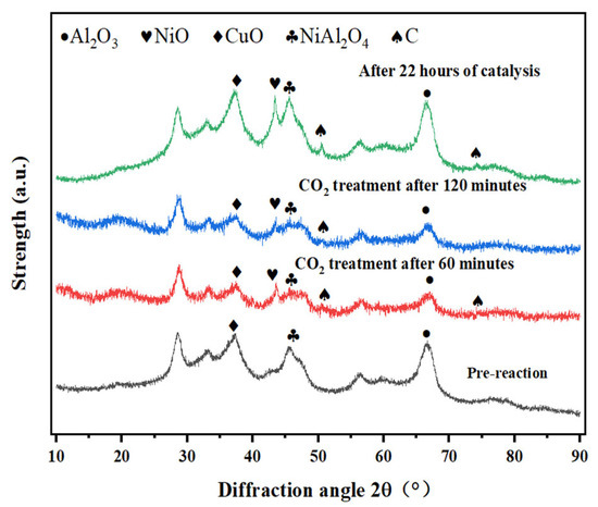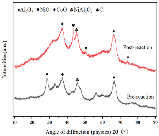 - Figure 1 reveals intensified NiO (Ni2+) diffraction peaks post-reaction, despite the marginal performance decline. This indicates that Ni2+ → Ni0 reduction dominates over time. Furthermore, Kwon et al. [20] demonstrate that NiAl2O4 spinel enhances dispersion of active Ni species in Ni/Al2O3 systems. Ni2+ ions liberated from NiAl2O4 form smaller metallic Ni particles (<5 nm) while strengthening metal–support interactions, thereby improving the activity, selectivity, stability, and coking resistance.