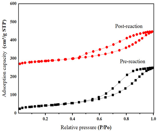 Figure 1 shows the XRD patterns of NiCuCe catalysts before and after the methanol conversion reaction. The post-reaction catalysts exhibit stronger CuO diffraction peaks accompanied by particle aggregation, a larger crystallite size, and enhanced crystallinity. Similarly, the NiO peak intensities increase after the reaction, indicating increased crystallinity. In contrast, NiAl2O3 peaks weaken, suggesting reduced phase content and crystallinity. The appearance of carbon diffraction peaks confirms carbon deposition as the primary deactivation mechanism. Figure 2 presents N2 adsorption–desorption isotherms of NiCuCe catalysts pre- and post-reaction. All samples show Type IV isotherms with H1-type hysteresis loops (according to IUPAC classification), confirming mesoporous structures. Subsequent analyses focused on the specific surface area, pore volume, and average pore size within the mesoporous framework.