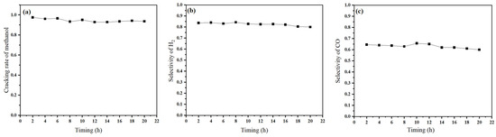Stability analysis of NiCuCe catalysts: (a) activity test; (b) H2 selectivity test; and (c) CO selectivity test.