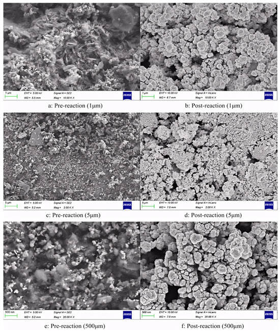 XPS measurements were performed using a Thermo Scientific K-Alpha X-ray photoelectron spectrometer (Puchuan Testing, Guangzhou, China) equipped with a neutralization gun to mitigate charge accumulation. Calibration was performed using the binding energy of 284.8 eV for the C1s orbital. Additionally, the instrument was fitted with an argon (Ar) ion beam etching attachment, which allowed the layer-by-layer etching of the sample by controlling the ion etching time. This enabled the determination of elemental and valence distributions at various depths. The XPS technique involves irradiating the sample surface and analyzing the spectrum of photoelectrons emitted to investigate the surface chemical composition and chemical states. BET surface area measurements were performed using a Micromeritics ASAP 2460/202 system (Micromeritics Instrument Corporation, Norcross, GA, USA) with a 3 kW X-ray generator using a Cu target. A horizontal goniometer was used with a minimum step size of 1/10,000 degree. Diffraction measurements were performed within a 2θ range of 0.5–5° with a small-angle attachment used for low-angle XRD analysis. SEM was performed using a Talos F200i S/TEM (Puchuan Testing, Guangzhou, China) with a resolution of ≤0.16 nm and scanning transmission electron microscopy magnification ranging from 310 million times to 330 million times. The maximum diffraction angle was 24° with a field emission gun, providing a total electron beam current of 150 nA. The sample stage was equipped with single-tilt and double-tilt holders, allowing for detailed surface morphology analysis at various resolutions for each sample.