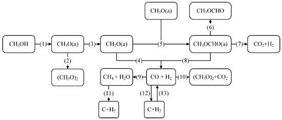The methanol cracking process involves a complex reaction network governing the formation of byproducts (H2, CO, and dimethyl ether). As illustrated in Figure 6, thirteen predominant reaction pathways were identified based on the reaction products observed in our experimental system and corroborated by the prior literature [21,22,23]. While the O-H bond cracking pathway (CH3OH → CH3O + H) is recognized as the primary initiation step in this system, alternative reaction routes warrant consideration. Notably, the C-O bond cracking pathway (CH3OH → CH3 + OH), despite its higher activation energy requirement, exhibits potential feasibility under elevated temperatures. CeO2 may regulate reaction pathways by stabilizing C-O bonds through oxygen vacancies generated by Ce3+ species. These oxygen vacancies function as active sites for adsorbing oxygen-containing intermediates (e.g., CH3O− or CO), thereby extending their residence time via C-O bond stabilization. This mechanistic framework preferentially promotes subsequent oxidation toward CO2 formation over deoxygenation pathways yielding CH4. These steps can be rationalized as follows: