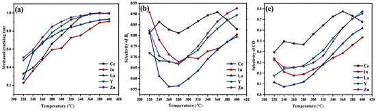This study synthesized NiCuCe along with NiCuY, NiCuZn, NiCuLa, and NiCuIn catalysts for methanol cracking applications. Their catalytic performance (activity and selectivity) was systematically evaluated over the temperature range of 220–400 °C. The results reveal NiCuCe’s superior overall performance, confirming the system’s practical relevance. Figure 7 compares the temperature-dependent behaviors of these catalysts. Figure 7a shows that NiCuCe maintains >99% cracking efficiency at temperatures above 320 °C but exhibits limited low-temperature activity (33.1% conversion at 220 °C). As depicted in Figure 7b, NiCuCe achieves sustained H2 selectivity (>80%) throughout the entire tested temperature range. Figure 7c reveals stable CO selectivity for NiCuCe, with a peak value observed below 380 °C.