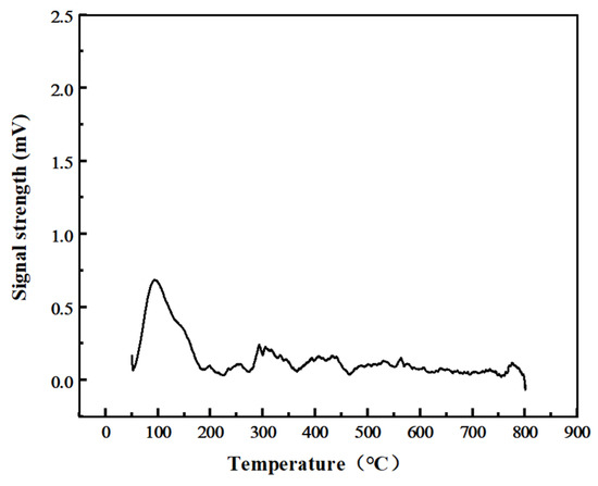 Carbon deposits can be identified through XRD patterns, while their morphological types are partially observable via TEM imaging. However, the precise quantification and complete characterization of deposited carbon requires TPO analysis. This study employs in situ TPO measurements to accurately determine carbon content and speciation, thereby eliminating the material loss risks associated with catalyst transfer. During TPO analysis, the simultaneous monitoring of CO and CO2 production enables a full carbon mass balance calculation. Notably, all TPO experiments exclusively detected CO2 emissions, with no measurable CO release, confirming complete CO-to-CO2 oxidation on Ni catalytic sites [25]. In situ CO2 TPD measurements were conducted to evaluate carbon gasification behavior. Figure 8 shows the TPO profile of the spent catalyst, revealing three distinct temperature zones: below 100 °C, 100–300 °C, and above 300 °C, with maximum carbon consumption occurring between 100 and 300 °C. The TPO peak positions correlate with carbon species types and spatial distribution on the catalysts [25,26]. The peaks in the 100–300 °C range correspond to the oxidation of non-filamentous/encapsulated coke near active sites (catalyzed by metallic centers), while amorphous carbon on supports, filamentous carbon (away from active sites), and graphitic carbon require higher oxidation temperatures (>300 °C). Methane decomposition (CH4 → C + 2H2) and carbon gasification (C + CO2 → 2CO) exhibit opposing temperature dependencies: elevated temperatures promote carbon deposition in the former but suppress it in the latter, resulting in maximum carbon accumulation at 200 °C for both catalysts.