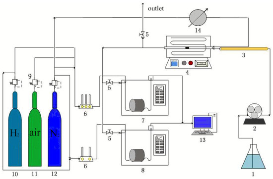 Schematic diagram of catalyst evaluation device (1, methanol conical cylinder; 2, peristaltic pump; 3, heating tape; 4, tube furnace; 5, gas two-way switch; 6, gas purifier; 7, FID detector; 8, TCD detector; 9, gas cylinder pressure reducing valve; 10, hydrogen generator; 11, air generator; 12, nitrogen cylinder; 13, workstation; and 14, mass flow meter).