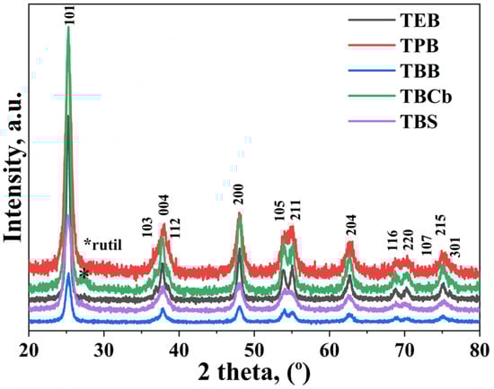 The X-ray diffraction (XRD) results indicate that anatase was the only detected crystalline phase in all samples (Figure 1) except TBCb, which was obtained with cationic surfactant CTAB and exhibited a small fraction of the rutile phase (4.9%) at 2θ of 27.44° (JCPDS no. 021-1276). The observed diffraction peaks at 25.2°, 37.7°, 48.0°, 53.8°, 55.0°, 62.6°, 68.76°, 70.26°, and 75.02° correspond to the crystal planes of the anatase phase: (101), (004), (200), (105), (211), (204), (116), (220), and (215), respectively (JCPDS no. 021-1272). These results can be considered the effects of the nonionic surfactants, which decrease the content of the rutile phase []. Therefore, the crystallite size of anatase is influenced by the type of surfactant used and increases in the following order: TBS < TBCb < TBB.