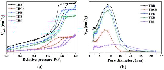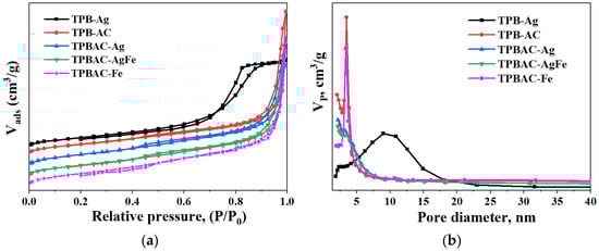 Therefore, the textural properties are mainly influenced by the addition of activated carbon in the TiO2 synthesis process. However, previous studies have shown that the crystalline structure of TiO2 may [] or may not be affected [], depending on the preparation method. In the case of the TPBAC sample, no effects on the crystal structure were observed. The N2 adsorption–desorption isotherms of the modified TiO2 samples show significant differences (Figure 3a) compared to those of unmodified titanium dioxide (see TPB sample in Figure 2). The adsorption branch of the isotherm for samples with AC resembles a type II isotherm with a H3 hysteresis loop, according to the IUPAC classification []. These results indicate the blockage of small pores and the formation of larger pores. In contrast, the sample without AC (TPB-Ag) displays a type IV isotherm with H2-type hysteresis. The modification of mesoporous TiO2 with Ag does not lead to significant changes in the textural parameters. However, the presence of metals decreases the specific surface area when they are immobilized on the TiO2 support with AC. Additionally, narrow pore size distributions are observed for all samples containing AC (Figure 3b).