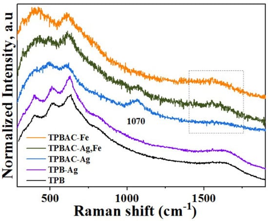 The TEM images (Figure S1) confirmed the presence of crystalline formations of TiO2 and of Ag nanoparticles []. UV–Raman spectroscopy provides valuable insights into the surface characterization of materials, playing a key role in detecting structural changes caused by doping and enabling the highly sensitive identification of the phase composition on the sample’s surface. All samples were investigated by Raman spectroscopy, and the results are illustrated in Figure 5. The TPB- and TPB-Ag-doped samples’ spectra exhibit peaks at 400 cm−1, 513 cm−1, and 626 cm−1, corresponding to the Raman-active modes of the anatase phase with symmetries B1g, (A1g + B1g) and Eg, respectively, which is confirmed by the XRD measurements. The spectra of samples with activated carbon, TPBAC-Ag/Ag, and Fe/Fe display similar spectral features to the TPB/TPB-Ag samples, but, for these samples, there are some variations in the intensity of the bending band at 513 cm−1, attributed to O–Ti–O symmetric (B1g) and antisymmetric (A1g) vibrational modes due to titania doping []. Moreover, the 1075 cm−1 band is assignable to Ag–O vibrations in Ag2O []. Intriguingly, silver oxide vibrations were observed in the samples with activated carbon.