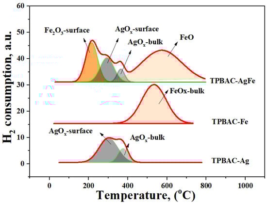The oxidation states of the active compounds in the modified TiO2 photocatalysts were analyzed using H2-TPR. The H2 consumption curves were fitted with a Gaussian function, as illustrated in Figure 8. The TPBAC-AgFe sample exhibited the highest hydrogen consumption (Table S3), which aligns with the XPS results, indicating the existence of most oxide species, such as Ag+, Fe3+, and Fe2+, on the surface. The weight percentages were calculated assuming that silver is present in the form of Ag2O and Fe in FeO, as the XPS results suggest that FeOx primarily exists in this form. The peaks observed at lower temperatures (~300 °C) are assigned to the reduction of surface Ag2O, while the Ag2O in the bulk is reduced at higher temperatures (396 °C for TPBAC-Ag and 382 °C for TPBAC-AgFe). The presence of Fe3+ species alongside Ag+ in the TPBAC-AgFe sample explains the existence of two reduction peaks for iron oxides. The first peak can be attributed to the reduction of surface Fe3+ ions to Fe2+. The second peak indicates the reduction of Fe2+ to metallic Fe, both on the surface and in the bulk. It can also be considered that Ag facilitates the reduction of iron oxide [,,].