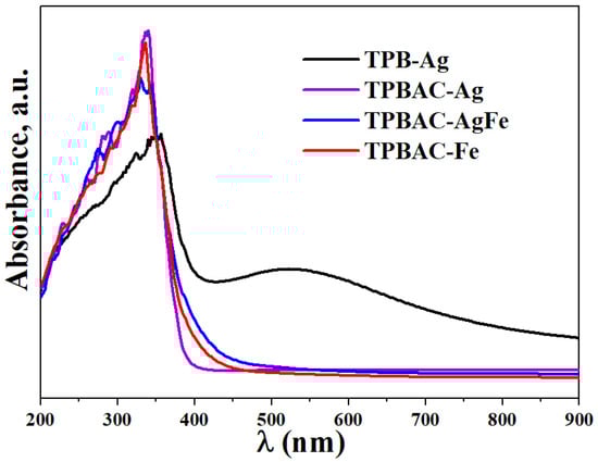 The UV–Vis spectra indicated a significant reduction in plasmonic absorption, characteristic of silver, for samples with activated carbon and Fe.