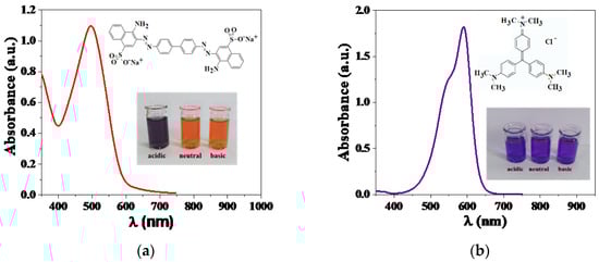 UV–Vis spectra and structures of unprotonated Congo Red (a) and Crystal Violet in cationic form (b); variations in their color with pH.