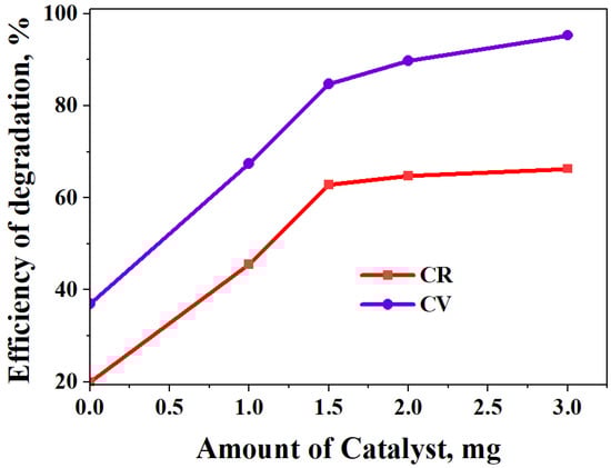 The CV and CR solutions were irradiated in the presence of varying amounts of catalyst (0, 1 mg, 1.5 mg, 2 mg, and 3 mg). Figure 12 shows a significant increase in efficiency with the catalyst amount up to 1.5 mg. Above this value, the efficiency increases much more slowly in the case of CR degradation and almost not at all in the case of CV. At high catalyst concentrations, the penetration of UV light into the suspension may be hindered due to increased opacity and light scattering. Additionally, at high catalyst loading, overlapping of the adsorption sites and the deactivation of the catalyst may also occur [,].