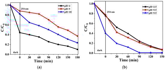 Effects of pH on CR (a) and CV (b) dye photodegradation using TPB-Ag photocatalyst (187.5 mg/L catalyst amount; 5 × 10−5 M concentration of CR solution; 2 × 10−5 M concentration of CV solution).