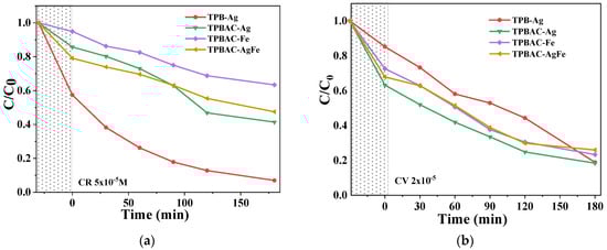 Variations in the photocatalytic efficiency with the pH for CR (a) and CV (b) degradation with and without a photocatalyst (5 × 10−5 M concentration of CR solution; 2 × 10−5 M concentration of CV solution; 187.5 mg/L photocatalyst amount; time of reaction: 180 min for CR and 150 min for CV, respectively; for CV degradation over TPB-Ag at a basic pH, the time was considered 90 min, the time necessary to obtain almost total degradation).