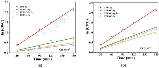 Kinetic analysis of photodegradation over various catalysts considering first-order mechanism: (a) CR dye, (b) CV dye.