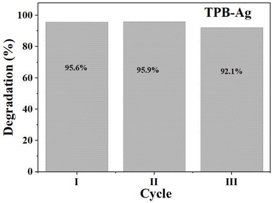 The recyclability of the TPB-Ag sample, which presented the highest photodegradation efficiency, was determined in CV photodegradation by using it in three cycles (Figure 17). After every cycle, the material was separated and then reused in a new reaction. Only a slight decrease in efficiency was observed after three cycles. Thus, it can be considered that the proposed materials are not only efficient, but they are also stable in reaction conditions.