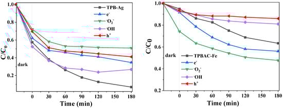 The photogenerated electrons from the TiO2, Ag2O, and Ag conduction bands arrive on the titanium dioxide surface. These transfers reduce e−and h+ recombination, which favors the photocatalytic reaction. Thus, the photogenerated electrons can react with O2 to generate superoxide anion radicals (•O2−), whose interaction with CV cationic dye is favored. The interaction of the CR anionic dye is favored by the electron-deficient active sites of the photocatalyst surface. The holes from the surface react with water to generate •OH radicals. Figure 18 indicates that •OH and •O2−are the active species involved in the photodegradation of dyes. The measurements of the PZC values and the corresponding pH levels, carried out in previous studies, indicated PZC values of 6.52 and 6.76, respectively, for the TPBAC and TPBAC-Fe samples []. Under these pH conditions, the strong adsorption of the dyes on the surface does not occur, with the reaction being driven by the formation and activity of reactive oxygen species (ROS) such as •OH and •O2−.However, the effect of the pH on CR and CV dye photodegradation (Figure 13) suggests the possibility of the dye’s interaction with different sites formed on the photocatalyst surface with a deficit or excess of electrons. At the same time, the involvement of reactive oxidizing species (•OH and •O2−) in the reactions is different. In the case of these reactions, the photocatalytic degradation efficiency of the dyes is determined by the differences in their adsorption on the acidic or basic centers of the surface.