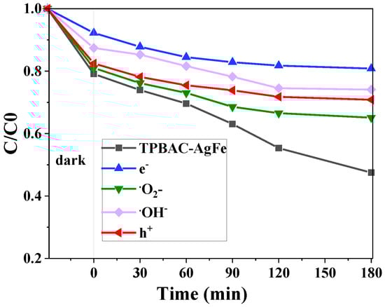 Under irradiation with light with a wide wavelength range (400–750 nm), the e− from the valence bands of iron or silver oxides are activated. These electrons, as well as those generated by plasmonic resonance, are transferred by metallic Ag and AC to the oxygen and water adsorbed on the surface, generating •O2− and •OH radicals.These active species cause the degradation of dyes. The holes from the VB of FeOx and Ag2O can migrate to their CBs, and electrons from the VB of TiO2 migrate to the VBs of the photoactivated oxides. The electrons from the CBs of TiO2, iron, and silver oxide can migrate to carbon or reduce Fe3+ ions, generating Fe2+ []. The electrons from the carbon surface and the superficial Fe2+ ions interact with the adsorbed oxygen molecules, forming •O2− radicals. Both the holes and the formed iron ions react with the adsorbed H2O to create •OH radicals. The presence of both Fe2+ and Fe3+ in the case of the TPBAC-AgFe sample favors the oxidation of both Fe2+ and water with the formation of •OH radicals.