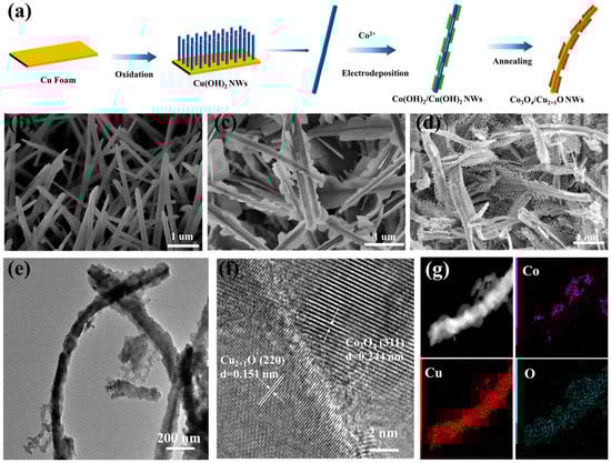 The synthesis of CoCuNWs is illustrated in Figure 1a, and the morphological evolution during the synthesis was confirmed by scanning electron microscopy (SEM). Under oxidation conditions, the copper foam was transformed into ordered nanowires (Figure 1b). After electrodepositing for 300 s at −0.8 V vs. SCE, the sheet–like Co species grows along the primary nanowires (Figure 1c). The subsequent annealing process not only induces structural hybridization but also facilitates the dehydration of hydroxides, resulting in the formation of numerous porous sheets, as shown in Figure 1d. These structures exhibit a large specific surface area, which is in agreement with previous studies on similar hydroxide systems []. The transmission electron microscopy (TEM) images (Figure 1e–g) also reveal the morphology of nanowires wrapped with array sheets. Figure 1f displays the interplanar spacings of 0.151 nm and 0.244 nm, assigned to the (220) plane of Cu2+1O and the (311) plane of Co3O4 [,]. Cu2+1O is a non–stoichiometric copper oxide in which copper coexists in both +1 (Cu+) and +2 (Cu2+) valence states accompanied by an abundance of oxygen vacancies and defective structures []. The combination of valence states and defects could result in a distinctive electronic structure and catalytic activity []. Meanwhile, a boundary between Cu2+1O and Co3O4 is clearly shown, meaning the existence of dual–metal Co3O4/Cu2+1O heterostructure. The elemental distribution spectrum (EDS) further presents the interface characteristics: Cu atoms are mainly concentrated in the core region of the nanowires, while Co atoms are distributed along the periphery area of Cu atoms (Figure 1g). The above results demonstrate that the CoCuNWs catalyst has been successfully prepared with the porous Co3O4 sheets grown on the surface of Cu2+1O nanowires.