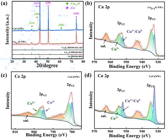 (a) XRD pattern of CoCuNWs and Cu2+1O NWs; (b) Cu 2p XPS spectrum of Cu2+1O NWs; (c) Co 2p XPS spectrum; and (d) Cu 2p XPS spectrum of CoCuNWs, where the circles represent the raw data and the red lines represent the fitted data.
