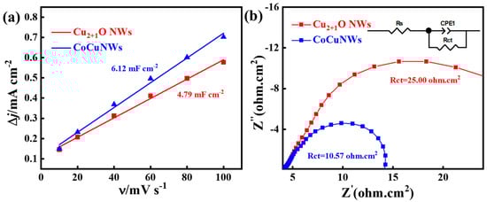 (a) Double–layer capacitance diagram and (b) electrochemical impedance spectra of Cu2+1O NWs and CoCuNWs in 0.5 M KOH solution.
