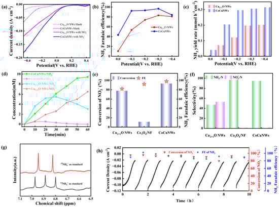 (a) LSV curves of the samples in 0.5 M KOH solutions with and without 10 mM KNO3 at a scan rate of 5 mV s−1; (b) Faraday efficiency of NH3 (FENH3); and (c) NH3 yield of the samples in 0.5 M KOH + 10 mM KNO3 solution at different potentials; (d) Concentration changes of NO3− and NH4+ on CoCuNWs at −0.2 V vs. RHE in 0.5 M KOH + 10 mM KNO3; (e) Conversion rate of NO3− and FE; (f) selectivity of NH3–N and NO2−–N over different samples at −0.2 V vs. RHE in 10 mM KNO3 and 0.5 M KOH; (g) 1H NMR spectra of electrolyte after the NO3− reduction at −0.2 V vs. RHE for 1 h using K14NO3 and K15NO3 as N–source; (h) Conversion rate and FENH3 of CoCuNWs during 10 consecutive tests at −0.2 V vs. RHE in 0.5 M KOH + 10 mM KNO3, with electrolyte replacement after each test.