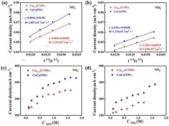 (a) The dependence of current density on t−1/2 for 0.1 M NO3− over CoCuNWs and Cu2+1O NWs. (b) The dependence of current density on t−1/2 for 0.1 M NO3− and 0.1 M NO2− over CoCuNWs and Cu2+1O NWs. (c) Current density of CoCuNWs and Cu2+1O in the electrolyte with different concentrations of NO3− at −0.4 V vs. RHE. (d) Current density of CoCuNWs and Cu2+1O in the electrolyte with different concentrations of NO2− at −0.4 V vs. RHE.