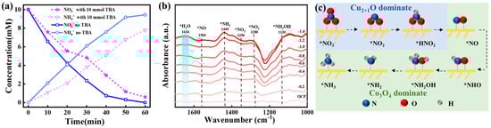 (a) Effect of TBA on the concentration changes of NO3− and NH4+ for CoCuNWs after 1 h reaction at −0.2 V vs. RHE in 0.5 M KOH + 10 mM KNO3; (b) ATR–SEIRAS spectra of the CoCuNWs catalyst in 0.5 M KOH and 10 mM KNO3 (* denotes adsorbed species). The background spectrum is obtained at open circuit potential; (c) a Schematic diagram of the NO3−RR pathway on CoCuNWs.