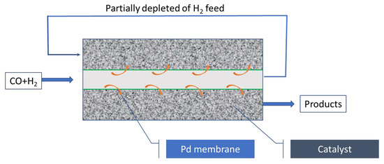 Forghani et al. [125] and Rahimpour et al. [126] also have simulated the Fischer–Tropsch reaction in a membrane reactor using a hydrogen selective membrane (Pd-based membrane). The basis of this reactor is the permeation of hydrogen to the reaction area and feeding the hydrogen depleted feed to the reaction area, where hydrogen is distributed (Figure 3).