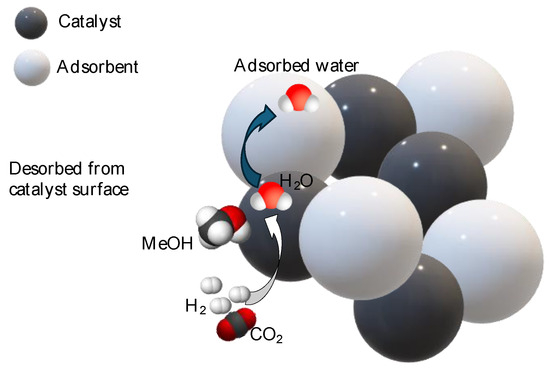The concept of sorption-enhanced reactions originated from the need to improve the efficiency of chemical processes by simultaneously conducting reaction and separation in a single unit. Along with water removal through membrane separation, the sorption-enhanced reaction (SER) technologies leverage the well-known Le Châtelier’s principle to improve a process performance. Unlike the previous configuration, water deletion from the reaction environment is produced by its sorption into a specific solid, which is generally put in contact with the catalyst, as shown in Figure 4 (exemplificative scheme in case of methanol synthesis enhanced by water removal).