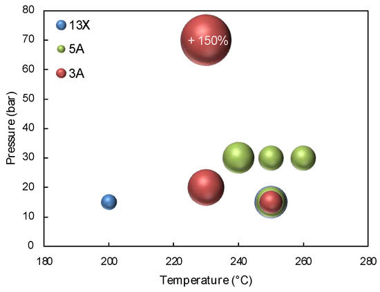 From the literature survey, it is possible to observe that SEMS studies have been conducted in a limited range of operating conditions and types of sorbents. Zeolites 3A, 5A and 13X have been studied most frequently, and as reported, 3A zeolite is the most suitable sorbent for SEMS, especially for its selectivity toward methanol. Many authors have attributed this characteristic to a shape selectivity, since the 3 Å pores of the zeolite allows the sorption of water but not methanol. On the other hand, 5A zeolite was demonstrated to be a significant alternative since it has a strong sorption capacity. 13X zeolite, despite being the first choice in former studies, was demonstrated to have a low selectivity and a scarce stability overtime in cycles of sorption/regeneration. Figure 5 shows a bubble graph of the different SEMS studies. This representation highlights the most employed combinations of operating conditions (temperatures mostly between 230 and 260 °C and pressures around 30 bar) together with the magnitude of methanol enhancement factor obtained with each kind of zeolite. The dimension of the bubble is proportional to the magnitude, and the maximum value is indicated in the figure.