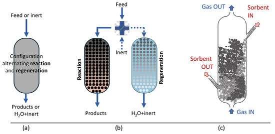 Continuous sorbent-flow technology proposed by Menéndez et al. [151,152] (c) compared to fixed bed reaction with alternating operations (a) and parallels fixed bed reactors (b).