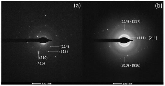The results of the SAED investigation are demonstrated in Figure 3a,b revealing diffraction patterns for SrGd2O4: Dy3+ (1 at%) and SrGd2O4: Ho3+ (1 at%), Yb3+ (6 at%), respectively. The polycrystalline structure of the samples is verified by the diffraction patterns visible as many bright spots (Figure 3a) and/or few thick diffraction rings (Figure 3b). Figure 3a reveals highly ordered bright spots, implying that particular grains exist as typical monocrystals. Nonetheless, distances between the diffraction center and bright spots were measured, exposing planes with Miller indexes (210), (114), (416), and (513), with d-spacing values of 0.283, 0.220, 0.143, and 0.160 nm, respectively. Calculated d-spacing values somewhat differ from the reference values for the planes (210) and (114), which can be ascribed to the adjustment of the unit cell parameters due to the ion swapping. Dy3+ ions are smaller than Gd3+ ions; hence, decreased interplanar spacing values after inserting Dy3+ instead of Gd3+ in the crystal lattice are anticipated. As for the sample doped with Ho/Yb, Figure 3b displays a diffraction pattern in the form of three thick diffraction rings, along with some bright spots. The appearance of diffraction rings suggests the polycrystalline structure of the sample. Since SrGd2O4 occurs as an orthorhombic lattice, which is verified by numerous diffraction peaks (JCPDS Card No. 01-072-6387), thick rings in the SAED image may refer to a few distinct but narrowly located diffraction rings merged altogether to form one thick ring. Having that in mind, it can be measured that the inner circle corresponds to the planes from (111) to (211), with d-spacing values from 0.316 to 0.278 nm, respectively. The middle and also the thickest diffraction circle indicate the presence of interplanar spacing distances from (114) to (117), with d-spacing values from 0.222 to 0.152 nm, respectively, while the outer circle corresponds to plane orientations with Miller indexes from (810) to (816), having d-spacing values from 0.118 to 0.102 nm, respectively. All presented results agree with the JCPDS Card No. 01-072-6387 assigned to SrGd2O4.