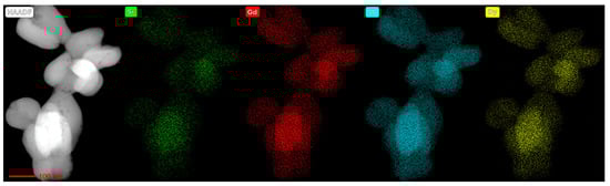 Acquired micrographs in the STEM mode, joined with EDS mapping, delivered significant understanding regarding the elemental composition of the as-synthesized samples. This investigation also provided valuable information on the dispersal of elements throughout the particles. STEM-HAADF micrographs with elemental mapping for the sample doped with Dy3+ are displayed in Figure 4, while the results of the same analysis for the sample doped with Ho3+ and Yb3+ are presented in Figure 5. Each chemical element is colored differently, showing the efficacious integration of dopants into the SrGd2O4 host lattice, as well as even distribution of all elements through the grains.