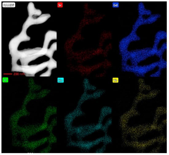 STEM-HAADF micrograph with EDS elemental mapping of all constituents of the SrGd2O4: Ho3+ (1 at%), Yb3+ (6 at%).