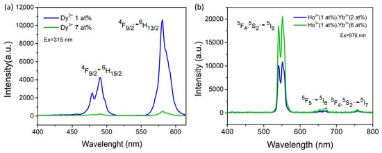 Emission spectra of (a) down-conversion Dy3+ (1 and 7 at%)-doped SrGd2O4 and (b) up-conversion Yb3+ (2 and 6 at%), Ho3+ (1 at%)-doped SrGd2O4.