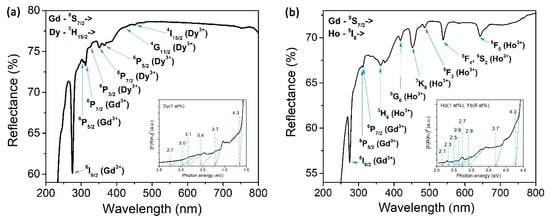 Optical measurements obtained by UV-VIS spectrophotometry can provide information on the material’s band gap energy, demonstrating its potential to be used as a photocatalyst. Diffuse reflectance spectra for selected samples doped with Dy3+ and Ho3+/Yb3+ are shown in Figure 7a,b respectively, along with derivative Kubelka-Munk functions as insets. Both DRS spectra showed maximums that can be assigned to Dy3+ and Gd3+ or Ho3+ and Gd3+ transitions, marked in each graph. Introducing various dopants clearly incites modifications in DRS spectra, noticeable in the region above 320 nm. Discovered peaks are a direct verification of the effective incorporation of dopants into the host lattice. Moreover, revealed peaks in the visible region are another indicator for a potentially good luminescent emission, which was previously demonstrated in the PL spectra shown in Figure 6.