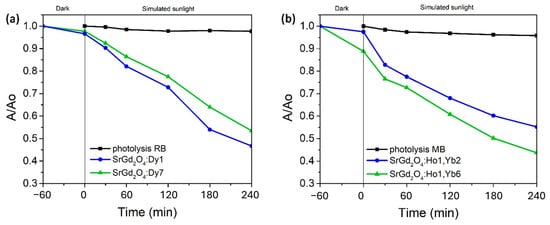 In the beginning, the photolysis of 3 ppm RB or MB aqueous solution was conducted to investigate the stability of the color under the light source, but without a photocatalyst (black line). Dye degradation was minimal, so the experiments of the photocatalytic degradation in the presence of down- or up-converting nanoparticles were conducted under the same conditions. Before the illumination, the dye solution with the photocatalyst was mixed in the dark to obtain adsorption-desorption equilibrium, which took one hour to complete. Dye adsorption onto the photocatalyst surface was proven to be sufficient to enable photocatalytic reaction. Next, the photocatalytic experiment continued for four hours under simulated sunlight. At the end of the photocatalytic experiment, the degradation rate for RB revealed that the initial dye concentration was reduced by 46% with SrGd2O4 doped with 7 at% Dy3+ and by 54% after using SrGd2O4 doped with 1 at% Dy3+, as illustrated in Figure 8a. As for the MB mineralization, the degradation rate showed a decrease in the starting concentration of 45% when SrGd2O4 doped with 1 at% Ho3+ and 2 at% Yb3+ was used and of 56% with the sample doped with 1 at% Ho3+ and 6 at% Yb3+, as depicted in Figure 8b.