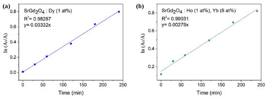 To evaluate the kinetics of the photocatalytic degradation reaction of RB, it was hypothesized that this reaction follows pseudo-first-order kinetics, since the dye is sufficiently diluted. Figure 9a depicts the results obtained for the photocatalytic degradation of the dye in the presence of the synthesized catalyst SrGd2O4 doped with 1 at% of Dy3+. This is confirmed by a line that passes through the origin with a coefficient of adjustment equal to 0.99559, demonstrating that the hypothesis is correct. Thus, under these conditions, the specific reaction rate, k, is 0.00332 min−1. The same assumption is made for the catalyst SrGd2O4 doped with 1 at% Ho3+ and 6 at% Yb3+ to evaluate its kinetics. The findings of the dye’s photocatalytic degradation are shown in Figure 9b. A coefficient of adjustment is equal to 0.99031, while the specific rate of reaction, k, is 0.00279 min−1.