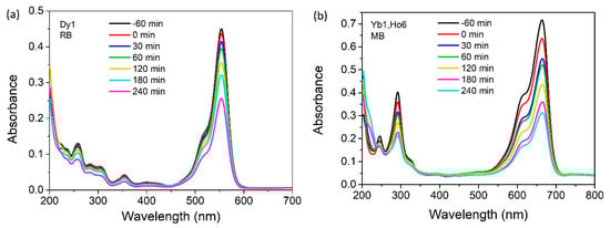 Changes in the UV-VIS spectra for the photocatalytic degradation of (a) 3 ppm RB with 20 mg SrGd2O4 doped with 1 at% Dy3+ and (b) 3 ppm MB with 20 mg SrGd2O4 doped with 1 at% Ho3+ and 6 at% Yb3+.
