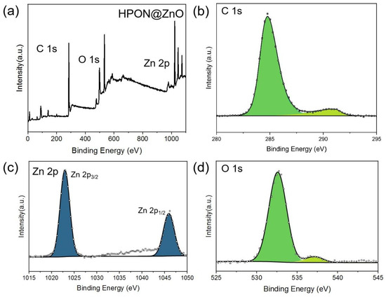 (a) XPS survey spectra of HPON@ZnO; (b) C 1s; (c) Zn 2p; (d) O 1s.