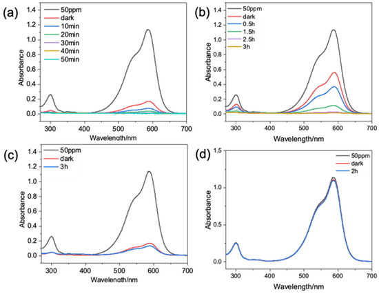 UV spectra of crystal violet solution degraded by HPON@ZnO-1M: (a) 10 mg of HPON@ZnO-1M with ultraviolet radiation; (b) 5 mg of HPON@ZnO-1M with ultraviolet radiation; (c) 10 mg of HPON@ZnO-1M without ultraviolet radiation. (d) No catalyst with ultraviolet radiation.