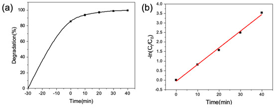 (a) The degradation rate of CV changes with time; (b) kinetic fitting of pseudo-first-order.